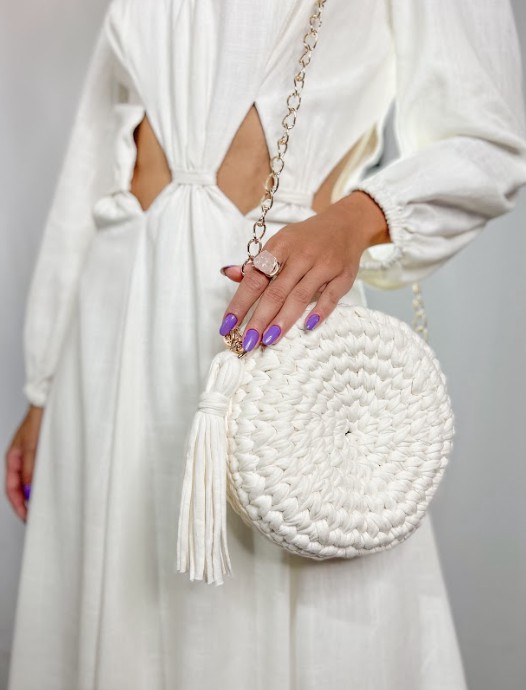 Bolsa de trama em crochê artesanal com forro de tecido e alça de corrente.