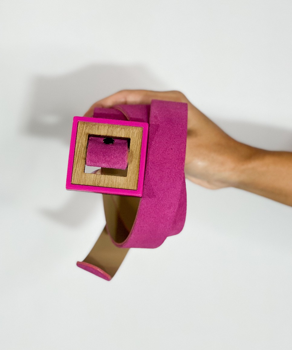 Cinto de couro legítimo com fivela de acrílico e detalhe em madeira. Formato quadrado.